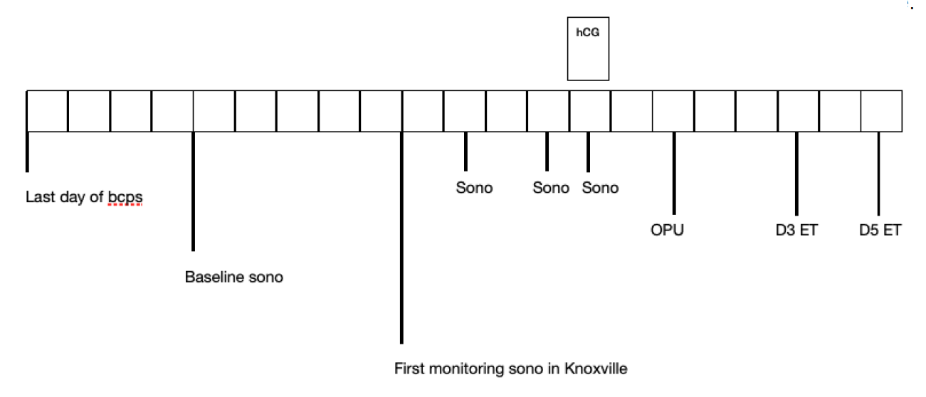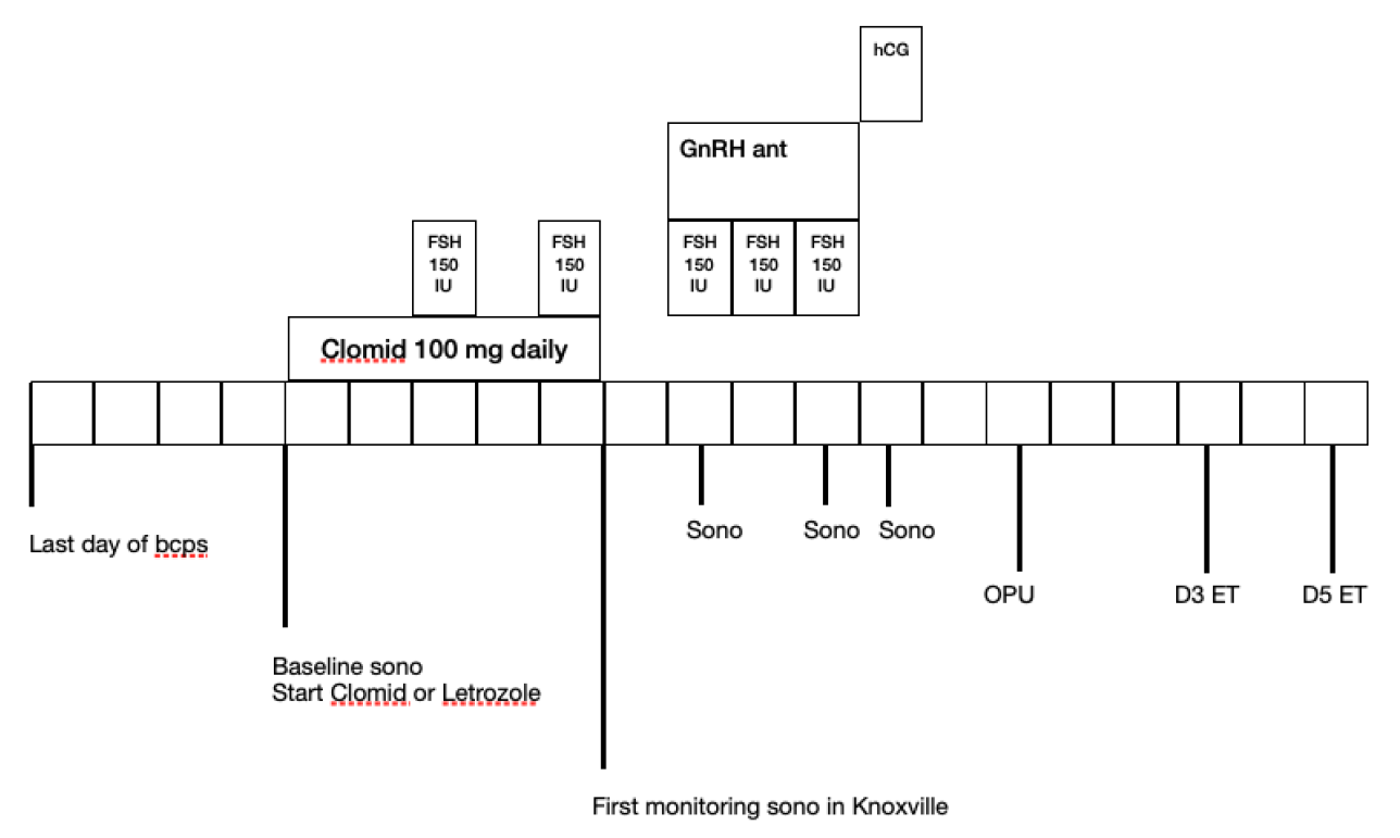 A typical NC IVF and Mini Stim IVF cycle are detailed below. Since we batch our IVF patients, you may need to take birth control pills or other medications to allow us to align your cycle with the clinic schedule. You will need to be in Knoxville for ultrasound monitoring starting on day 7-8 depending on your protocol. Most patients take the hCG trigger shot on day 12 or so. A trigger on day 12 means an egg retrieval on day 14. Day 3 embryo transfer would be on 17 and day 5 embryo transfer would be on day 19. The day of embryo transfer you can depart by car, and the day after embryo transfer, you are free to fly home. Pregnancy tests are scheduled for 11 days after a day 3 ET and 9 days after a day 5 ET.